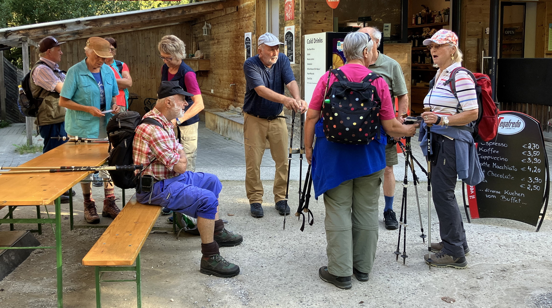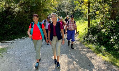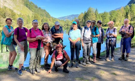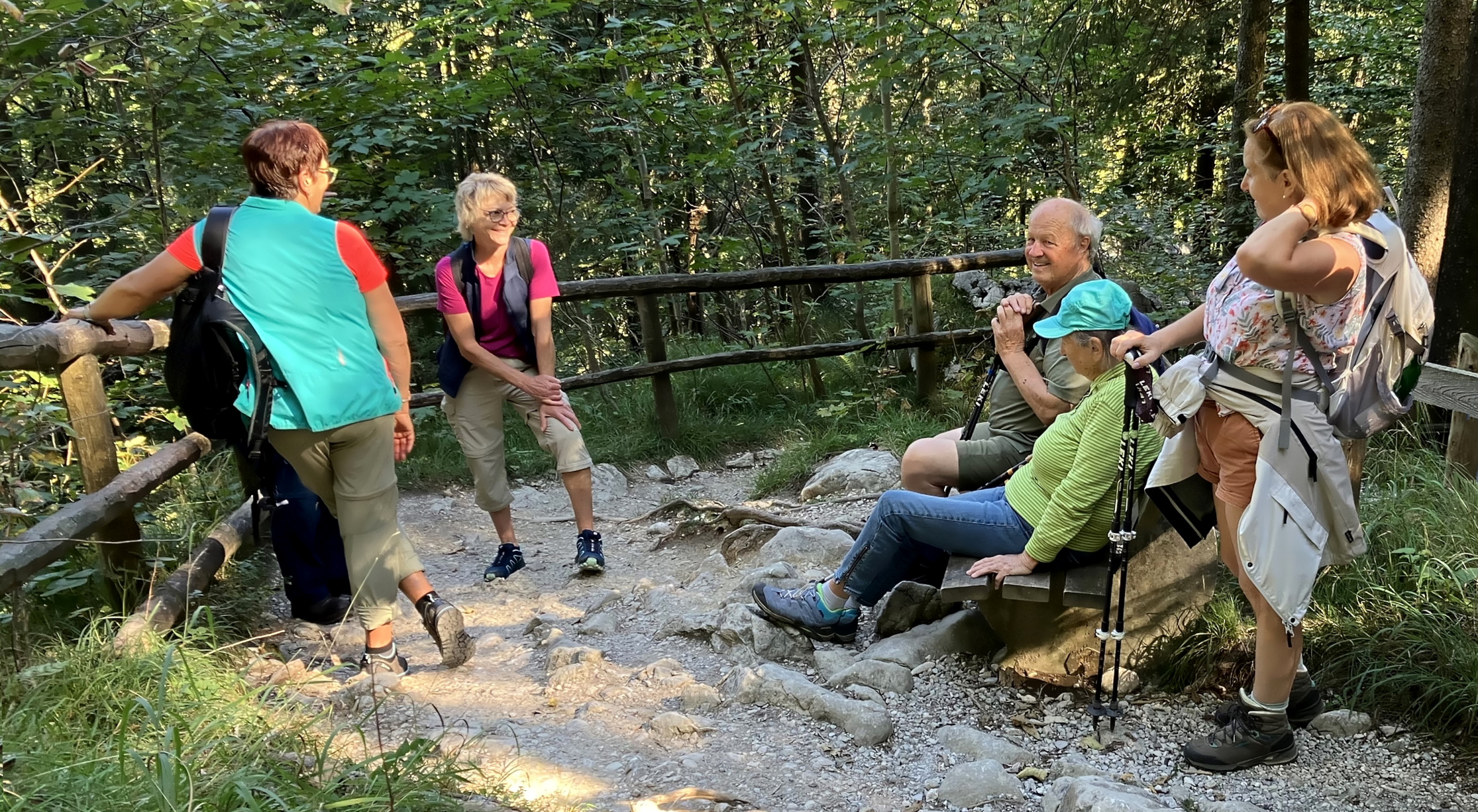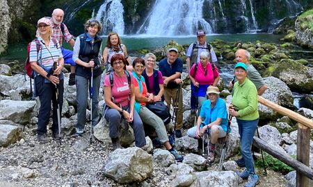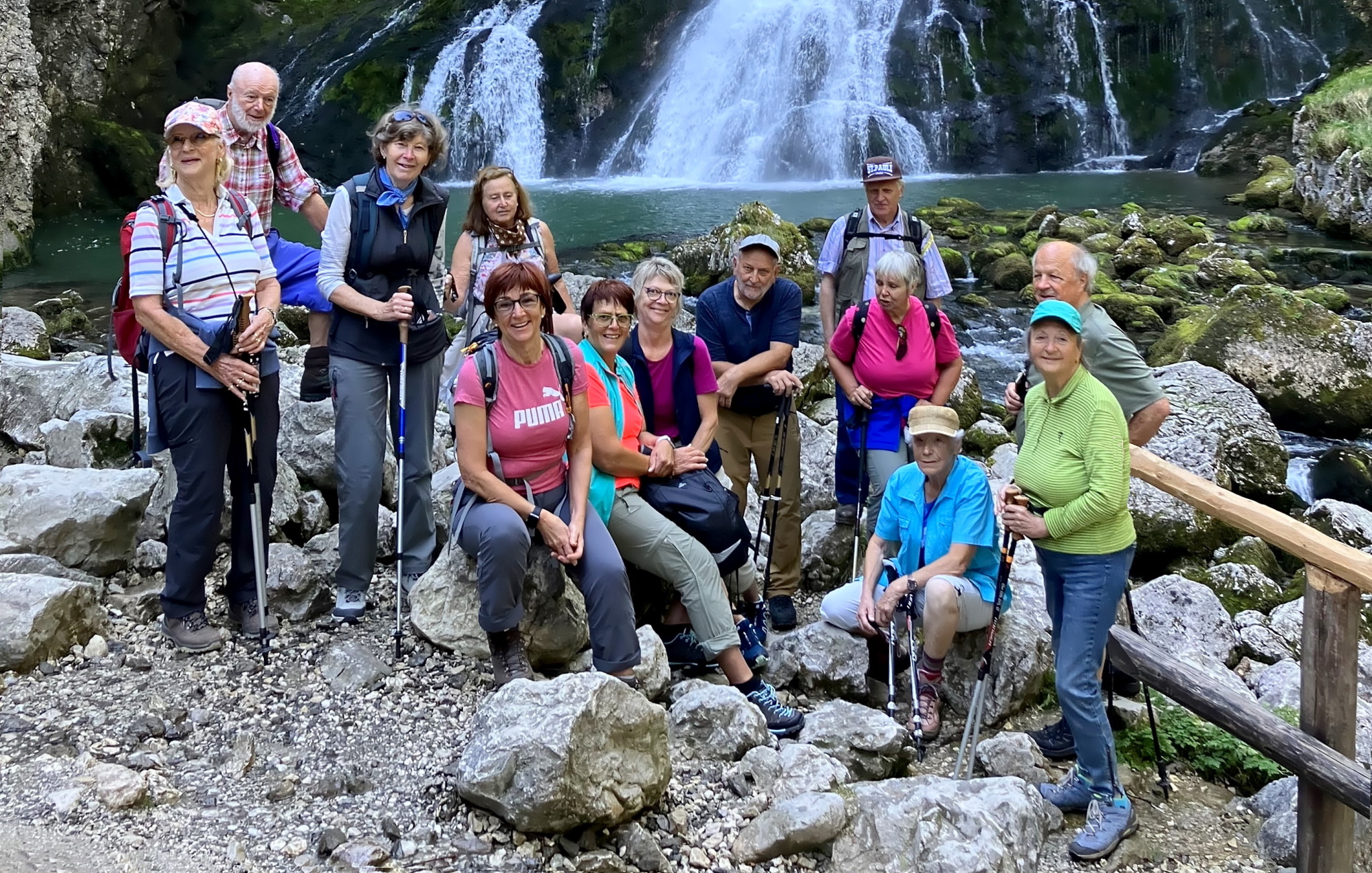 Bad Griesbach mit ihren Tourenbegleitern Irene und Gerhard Graw. Bei herrlichem Sonnenschein und sommerlichen Temperaturen war der Gollinger Wasserfall und das romantische Bluntautal Ziel der Genusswanderer. Angekommen am Wander-parkplatz in Golling erreichte man nach einem kurzen Anstieg die untere Fallstufe des 2-stufigen Wasserfalls, der über 76 Meter aus einer Karstquelle in die Tiefe stürzt. Ein Teil der Gruppe ließ es sich nicht nehmen die gut ausgebaute Steiganlage links und rechts des Wasserfalls bis zum Quellportal am Hexenkesselsteg über Treppen und Brücken zu erklimmen. Es war ein überwältigender Blick hinunter in die Tiefe, sowie gegenüber zum Schlenken, Schmittenstein und Schwarzer Berg, bevor es wieder hinab ging zum Ausgangspunkt Richtung Bluntautal. Die nicht ganz so wanderfesten Teilnehmer, die sich den Aufstieg bis nach ganz oben ersparen wollten, fuhren mit dem Bus weiter zum Parkplatz in Torren und erwarteten die Wasserfall-geher bei den Bluntauseen. Diese erreichten entlang an der Felskulisse des Hohen Göll, durch schattigen Wald und einem Abstecher zur St. Bartholomäus-Kapelle das Tal der Torrener Ache und auf einem Waldweg die smaragdgrünen Seen. Begeistert von der Farbe des Wassers und den Blick auf das Göllmassiv und Hagengebirge ging es nach einer kurzen Rast gemeinsam auf einem schmalen, romantischen Weg weiter in Richtung Bärenwirt. Nach einer ausgiebigen Einkehr mit deftigen Schman-kerln, sowie Kaffee und Kuchen, entschloss man sich den Bluntautal-Wasserfall nicht mehr zu erwandern, da dieser nur bei Starkregen oder Schneeschmelze Wasser führt. Somit machte man sich auf der anderen Seite des Baches auf den Rückweg zum Parkplatz, wo der Bus auf die Wanderer wartete. Ein letzter erlebnisreicher und sonniger Tag in den Salzburger Alpen ging zu Ende.