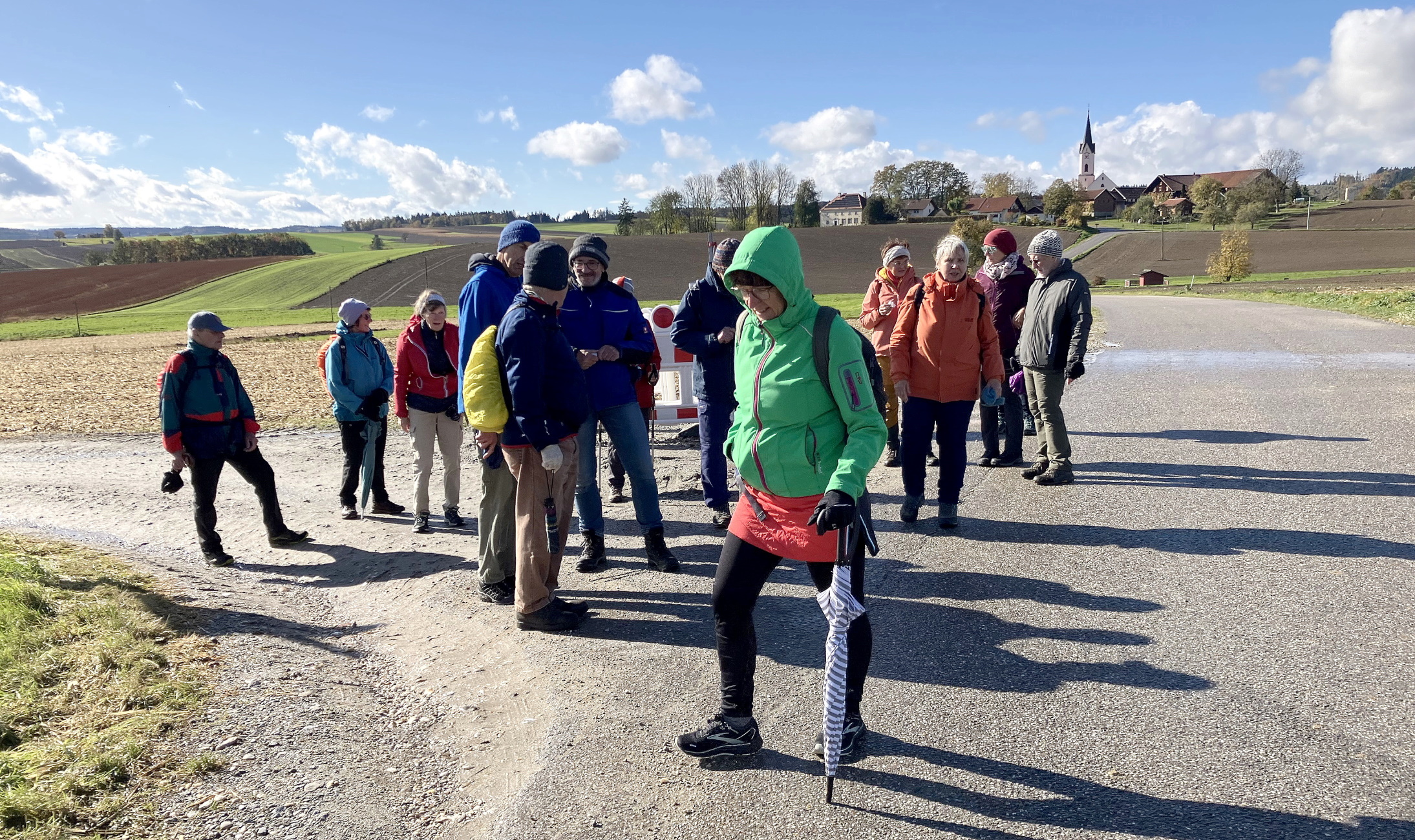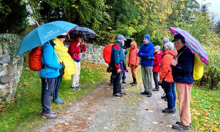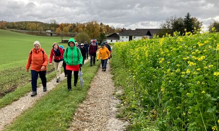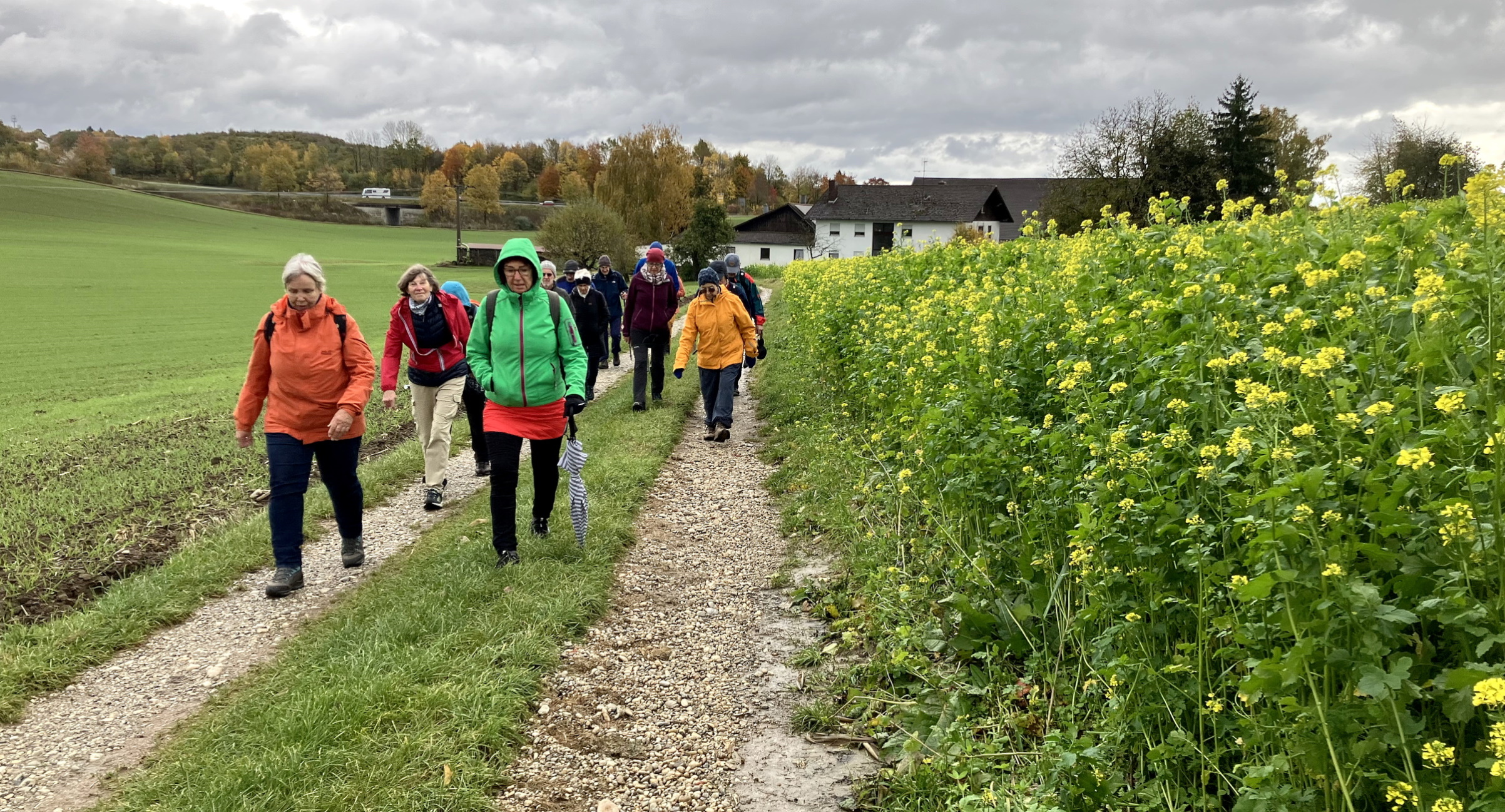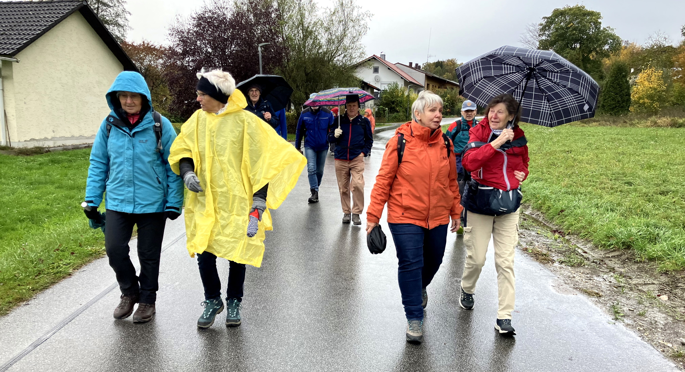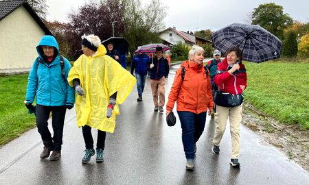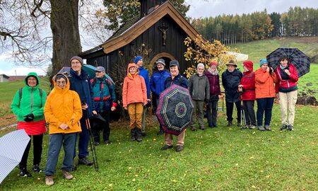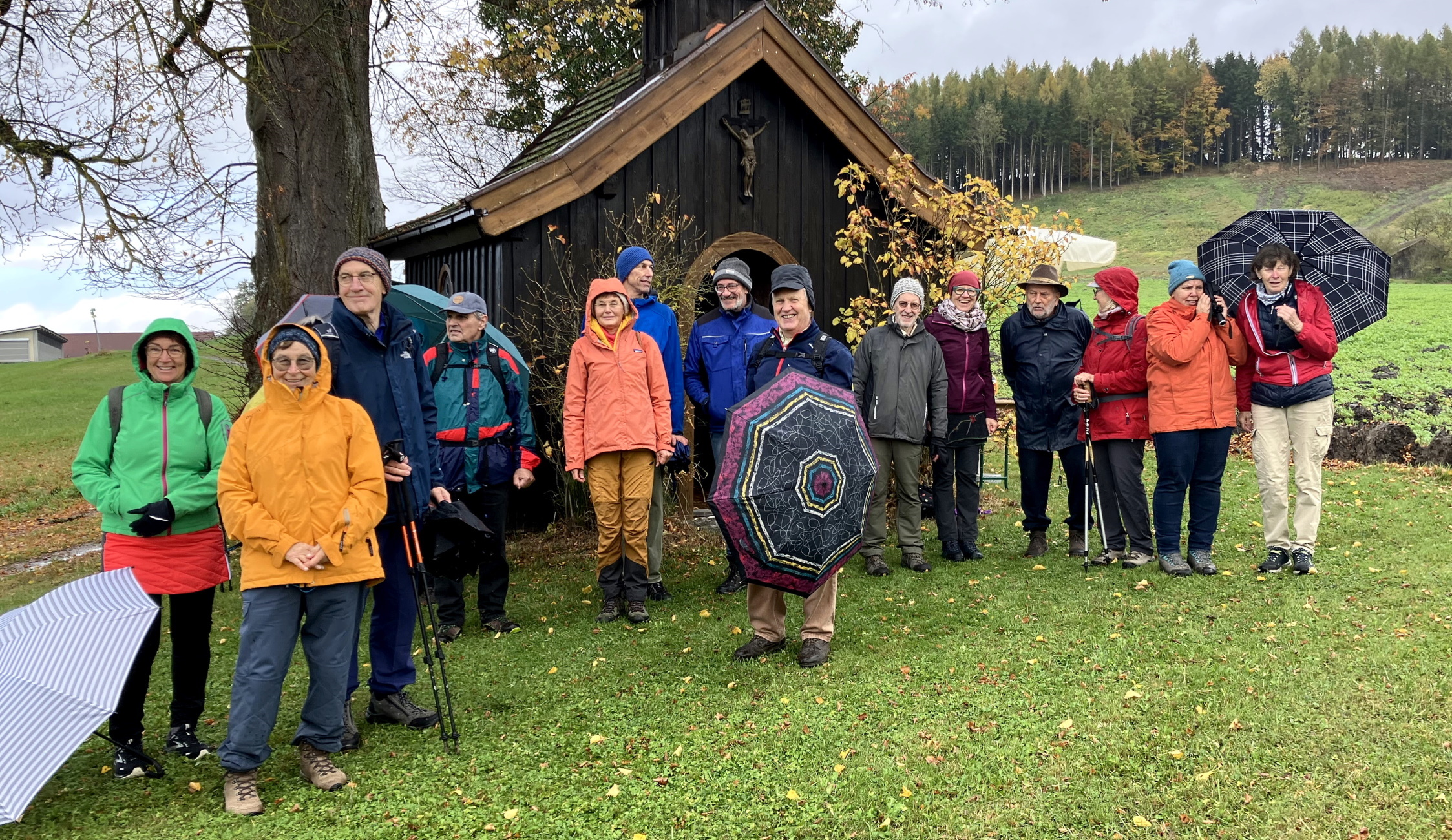 Die letzte offizielle Wanderung der DAV-Sektion Bad Griesbach für dieses Jahr unternahmen 17 wetterfeste Wanderer und erkundeten unter Tourenbegleiterin Irene Graw die Umgebung von Bad Griesbach. Beim Treffpunkt am Sportgelände regnete es noch und mit Schirmen und Regencapes ausgerüstet marschierten die Teilnehmer trotz des widrigen Wetters los und schon nach kurzer Strecke hörte der Regen auf und es ging auf dem Höhenweg Richtung Kurgebiet. Beim durchqueren des Kurwaldes schien bereits die Sonne, das bunte Laub unter den Füßen und an den Bäumen hob die Freude auf die weiteren Höhepunkte der Wanderung. Angekommen an der Kurverwaltung wurde eine kurze Pause eingelegt, um dann entlang des Via Nova Weges nach Oberham und weiter nach Aicha im Tal zu gehen. Dicke Regenwolken zogen auf und die Gruppe hatte das Glück die kleine Kapelle bei Aicha noch zu erreichen, denn dort erwartete Gerhard Graw die hungrigen Wanderer mit einer Brotzeit und einer flüssigen Belohnung in Form von selbstgemachten Likören. Ein kurzes Unwetter mit heftigem Sturm und Regen ließ die Teilnehmer in die Kapelle flüchten und so wurde noch ein kurzes Dankgebet für die unfallfreien Bergtouren gesprochen, um dann die Tour weiter nach Parzham fortzusetzen. Nach kurzer Pause am Bruder Konrad Hof ging es bei Sonnschein weiter nach Moos und Amsham dem Ziel einer ausgiebigen Rast entgegen. Doch bevor die Wanderer sich mit Kaffee, Kuchen und herzhaften Gerichten stärken konnten, mussten sie noch ein paar steile Höhenmeter überwinden, um dann im Cafe Maierhof 2 einzukehren. Gemütlich in der warmen Gaststube zu sitzen und die angebotenen Speisen zu verzehren genossen alle Teilnehmer, denn die letzten Meter bis zum Startpunkt der Wanderung mussten noch zurückgelegt werden. Zufrieden mit dem Wettergott, der doch noch die Sonne scheinen ließ, endete der letzte Wandertag der Saison 2025 mit glücklichen Teilnehmern.