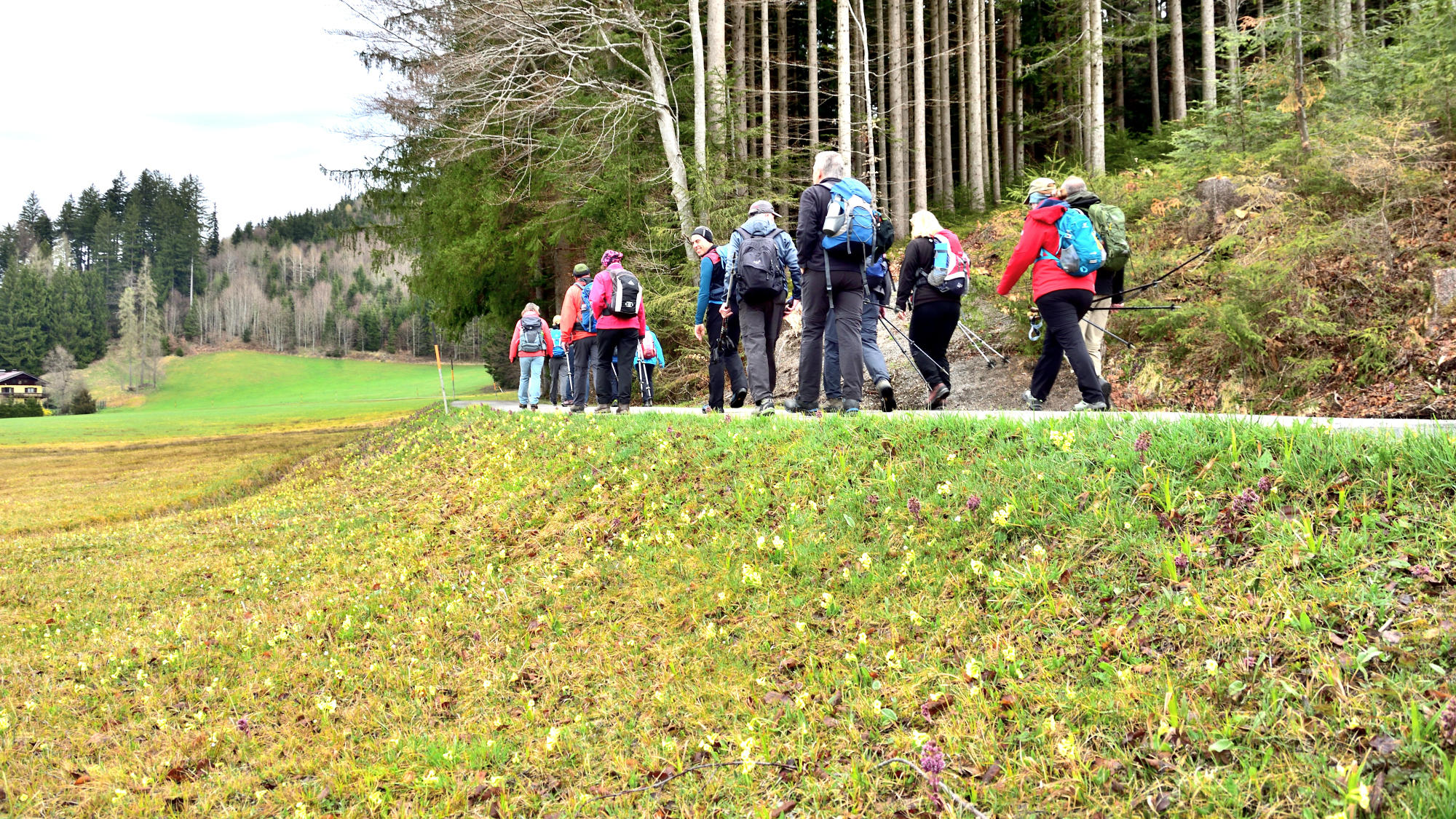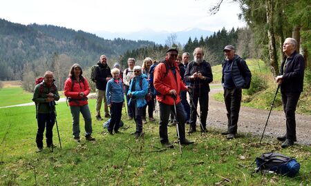DAV Bad Griesbach-Pocking erwandert die Große Plaike und den Kolomansberg. Während sich in den Hochlagen der Alpen, ab etwa 1.500m Höhe, noch hartnäckig der Schnee hält, sind die Voralpen das ideale Wanderziel. Südöstlich vom Wallersee erstreckt sich ein teils bewaldeter Höhenzug auf dem sich schon von weitem zwei weißen Radarkugeln zeigen. Es ist der Kolomansberg mit seinen Nebengipfeln Lehmberg und Große Plaike. Diese drei Gipfel bieten gerade im Frühjahr herrliche Blicke ins Alpenvorland und in die noch schneeweißen Alpen. Für zwölf wanderbegeisterte Mitglieder vom Alpenverein Bad Griesbach-Pocking hatte sich Bergwanderleiterin Anita Kälker genau dieses Gebiet als Ziel ihrer Frühjahrswanderung ausgesucht. Ausgangspunkt war der Wanderparkplatz Wasenmoos oberhalb von Thalgau. Bei trockenem Wetter, aber leider bewölktem Himmel startete die Gruppe. Das erste Stück des Weges zog sich nach Norden. Schlüsselblumen, Lerchensporn und Sumpfdotterblumen blühten bereits in rauen Mengen und säumten den Weg. Oberhalb eines Wiesenhanges zeigte sich ein altes Anwesen. Das schwarze Holz der Gebäude und ein in voller Blühte stehender großer Baum zogen sofort die Blicke auf sich. Langsam gewann die Gruppe an Höhe und so zeigten sich auch schon die ersten schneebedeckten Berge der Osterhorngruppe. Nun schwenkte der Wanderweg in westliche Richtung. Das Gras der Freifläche war noch braun und überall zeigten sich junge Bäumchen die in ein paar Jahren den Hang wieder bewalden. Beim nächsten Wegweiser lud eine Bank ein zur kurzen Rast. Anschließend ging es in den Wald. Aus dem Wanderweg wurde ein Pfad der die Gruppe hinauf zum Steinwandl führte. Die Wolkendecke lockerte etwas auf und kaum ließ sich die Sonne blicken ging es auch mit den Temperaturen nach oben. Bänke und Tische auf dem herrlichen Aussichtsplatz wurden sofort in Beschlag genommen. Gerne machte man hier eine längere Pause. Nach Norden schweiften die Blicke über den Wallersee hinaus ins Alpenvorland bis zu den Windrädern im Kobernaußer Wald. Nach Süden gäbe es eine herrliche Sicht auf die Berge, aber leider trübte Saharastaub die Luft. Anschließend folgte wohl der schönste Abschnitt der Tour. Ein Höhenwanderweg zieht sich nun immer auf 950 m bis gut 1.000 m Höhe von West nach Ost. Ein schmaler Pfad leitete die Wanderer durch den noch lichten Bergwald bis zur nächsten „Freisicht“ hinüber zu den Radarkugeln am Kolomansberg. Wäre jetzt nicht der Saharastaub in der Luft gäbe es freie Sicht auf das Tennengebirge, den Dachstein und die Berchtesgadener Alpen. Es folgte der unscheinbare Gipfel der Großen Plaike, 1.034 m. Das Gipfelkreuz versteckte sich zwischen den Bäumen. Schon etwa einen halben Kilometer weiter wartete schon der nächste Rastplatz beim Heimkehrerkreuz mit Wallerseeblick. Im leichten Auf und Ab wanderten die Bergler nochmals vorbei an einem Gedenkkreuz bevor der baumlose Höhenrücken vom Lehmberg die Wanderer zum Kolomanstaferl brachte. Nun zeigte sich auch der westliche Teil vom Mondsee und der gleichnamige Ort. Auch die Kirche auf dem Kolomansberg war nun zu sehen. Nun schwenkte die Route nach Süden hinab in die Kolomansenke und sogleich wieder steil bergauf. Über den Nordhang erwanderten die DAVler nun den Kolomansberg. Mit 1.100m Höhe war er der höchsten Punkt der Wanderung. Oben angekommen war erstmal verschnaufen angesagt. Natürlich wurde auch die Kirche besichtigt. Sie ist die älteste Holzkirche Österreichs und ein wahres Kleinod. Den Innenraum der Kirche schmücken zahlreiche Votivgaben und Sterbebilder. Nach einer weiteren Pause ging es im Anschluss auf dem Wanderweg 8 nur noch bergab. Nach 150 Höhenmetern verwies ein Wegweiser nach Westen. Auf Schotterwegen und schmalen Sträßchen marschierten die DAVler nun durch die malerische Kulturlandschaft des Thalgaus. Es ging vorbei an alten Gehöften und verstreuten Anwesen inmitten sattgrüner Wiesen. Ständig zog die steil abfallende Drachenwand, der Schober und der Frauenkopf die Blicke auf sich. Kurz nach 15.00 Uhr erreichten die Wanderer wieder den Ausgangspunkt. Natürlich ging es später noch zur wohlverdienten Einkehr im nahen Henndorf.