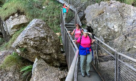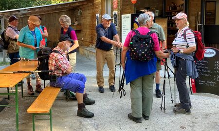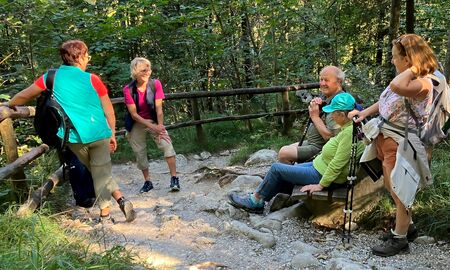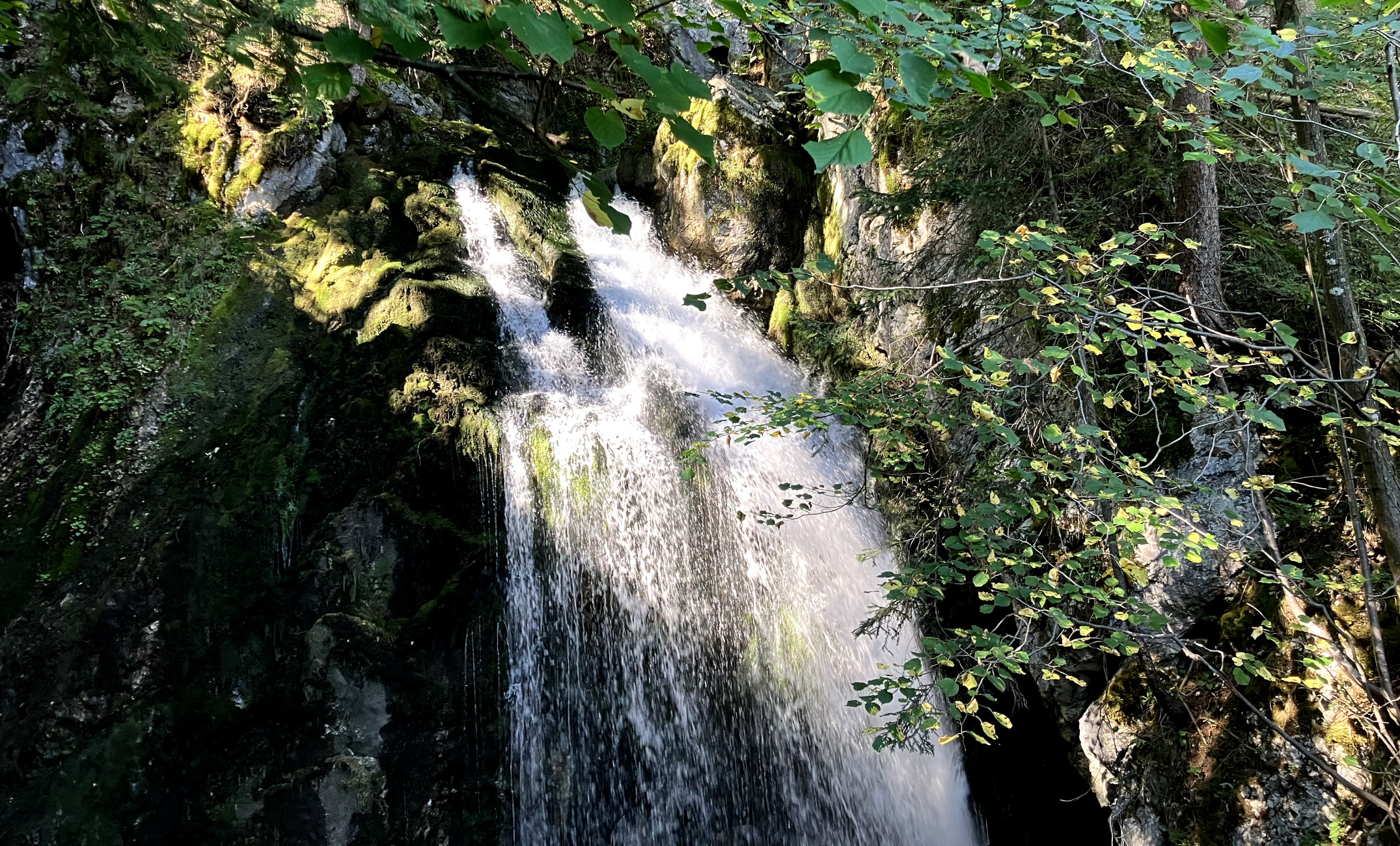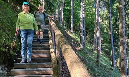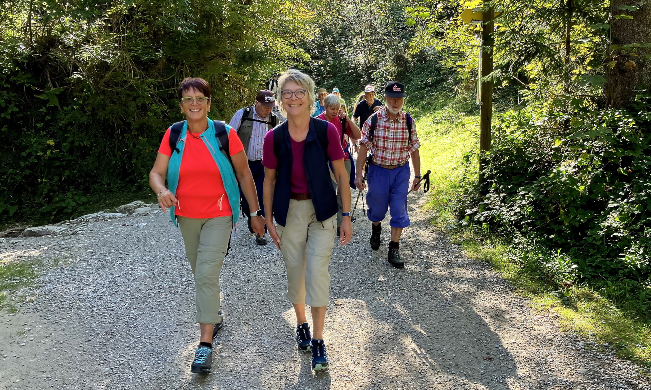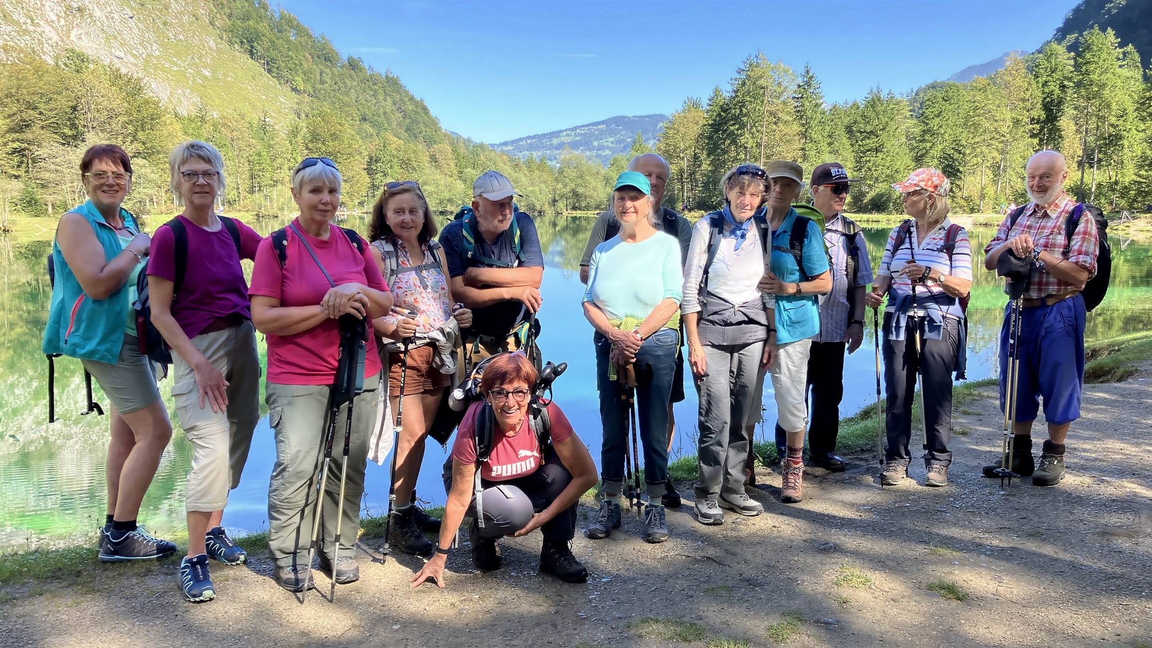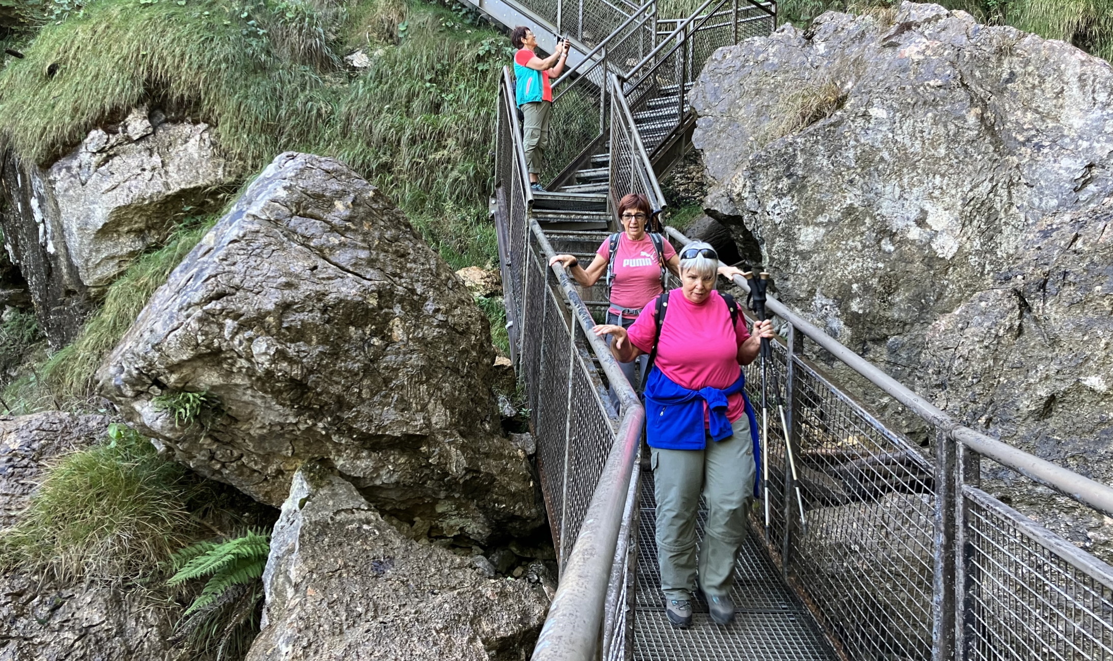 Bad Griesbach mit ihren Tourenbegleitern Irene und Gerhard Graw. Bei herrlichem Sonnenschein und sommerlichen Temperaturen war der Gollinger Wasserfall und das romantische Bluntautal Ziel der Genusswanderer. Angekommen am Wander-parkplatz in Golling erreichte man nach einem kurzen Anstieg die untere Fallstufe des 2-stufigen Wasserfalls, der über 76 Meter aus einer Karstquelle in die Tiefe stürzt. Ein Teil der Gruppe ließ es sich nicht nehmen die gut ausgebaute Steiganlage links und rechts des Wasserfalls bis zum Quellportal am Hexenkesselsteg über Treppen und Brücken zu erklimmen. Es war ein überwältigender Blick hinunter in die Tiefe, sowie gegenüber zum Schlenken, Schmittenstein und Schwarzer Berg, bevor es wieder hinab ging zum Ausgangspunkt Richtung Bluntautal. Die nicht ganz so wanderfesten Teilnehmer, die sich den Aufstieg bis nach ganz oben ersparen wollten, fuhren mit dem Bus weiter zum Parkplatz in Torren und erwarteten die Wasserfall-geher bei den Bluntauseen. Diese erreichten entlang an der Felskulisse des Hohen Göll, durch schattigen Wald und einem Abstecher zur St. Bartholomäus-Kapelle das Tal der Torrener Ache und auf einem Waldweg die smaragdgrünen Seen. Begeistert von der Farbe des Wassers und den Blick auf das Göllmassiv und Hagengebirge ging es nach einer kurzen Rast gemeinsam auf einem schmalen, romantischen Weg weiter in Richtung Bärenwirt. Nach einer ausgiebigen Einkehr mit deftigen Schman-kerln, sowie Kaffee und Kuchen, entschloss man sich den Bluntautal-Wasserfall nicht mehr zu erwandern, da dieser nur bei Starkregen oder Schneeschmelze Wasser führt. Somit machte man sich auf der anderen Seite des Baches auf den Rückweg zum Parkplatz, wo der Bus auf die Wanderer wartete. Ein letzter erlebnisreicher und sonniger Tag in den Salzburger Alpen ging zu Ende.